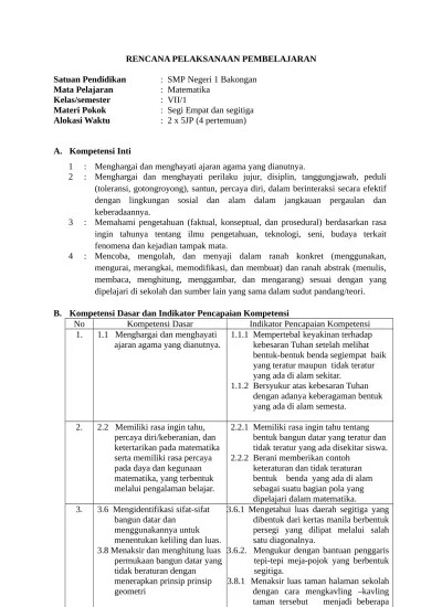 Rpp materi segi empat dan segitiga kelas 1 smp semester 2. Matematika untuk sp/mts kelas vii kurikulum 2013 edisi revisi. Rencana pelaksanaan pembelajaran (rpp) sekolah: Memahami konsep segi empat dan segitiga serta menentukan ukurannya. Rencana pelaksanaan pembelajaran materi segiempat dan segitiga dengan model project based. 14 jam pelajaran (7 x pertemuan) . Rpp segitiga dan segi empat ini di desain sesuai dengan model penerapan kurikulum 2013. Rpp segitiga dan segiempat kurikulum 2013 ini memiliki muatan yang sangat banyak yaitu 7 kali pertemuan dengan alokasi waktu 20 jam pelajaran. Pembelajaran siswa pada materi segitiga dan segi empat untuk siswa kelas vii smp. Menghargai dan menghayati ajaran agama yang dianutnya . Segitiga dan segiempat alokasi waktu :